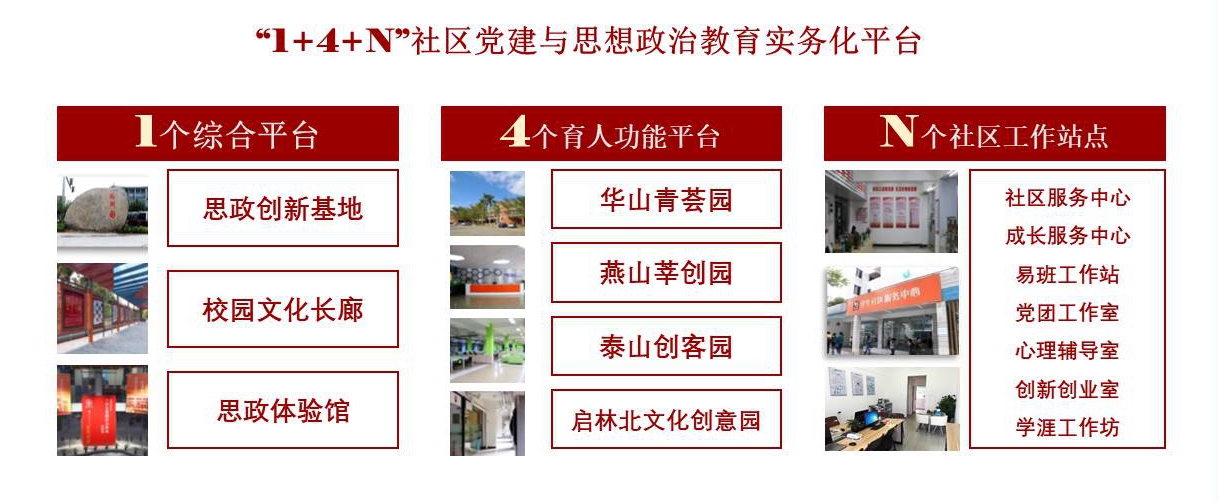 學(xué)校集課內(nèi)課外、線下線上、校內(nèi)校外育人資源,在學(xué)生社區(qū)搭建了“1+4+N”學(xué)生社區(qū)黨建與思想政治教育實(shí)務(wù)化平臺(tái)。
